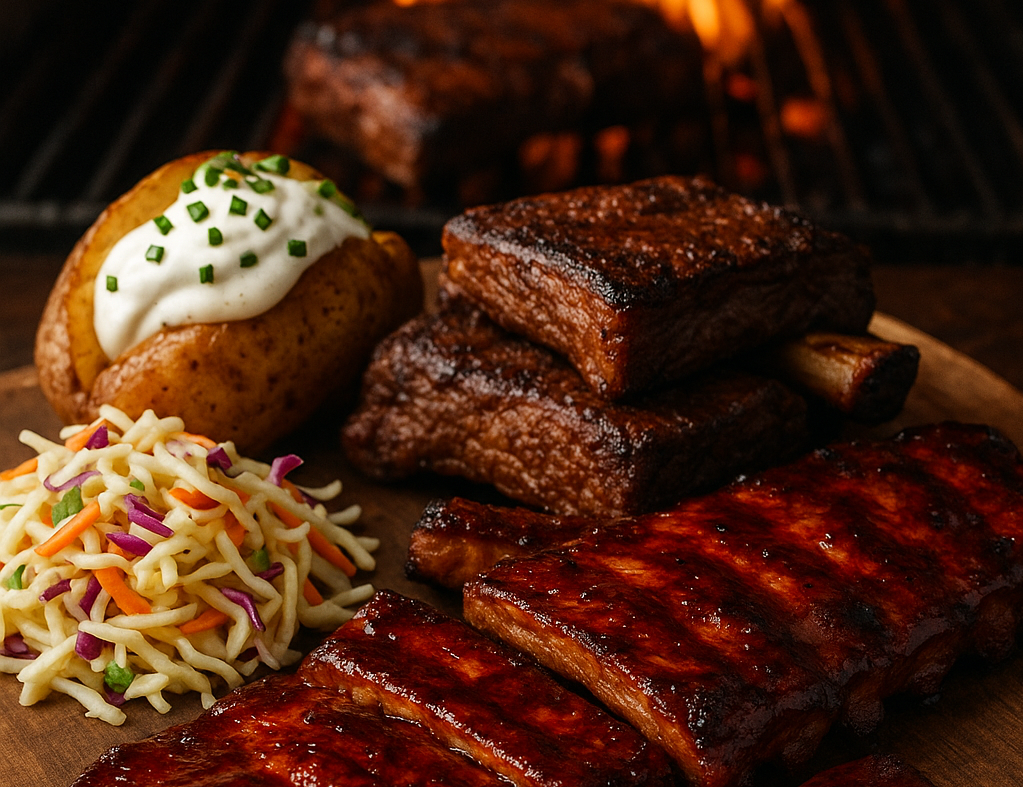 Dazu klassischer Coleslaw und ofenfrische Baked Potatoes mit Sour Cream